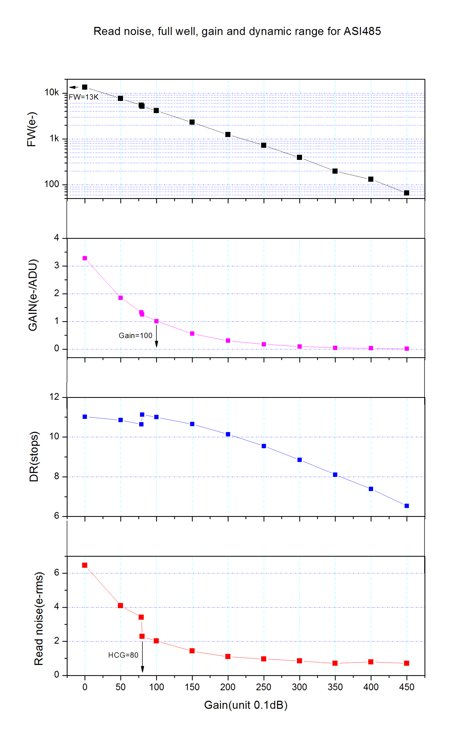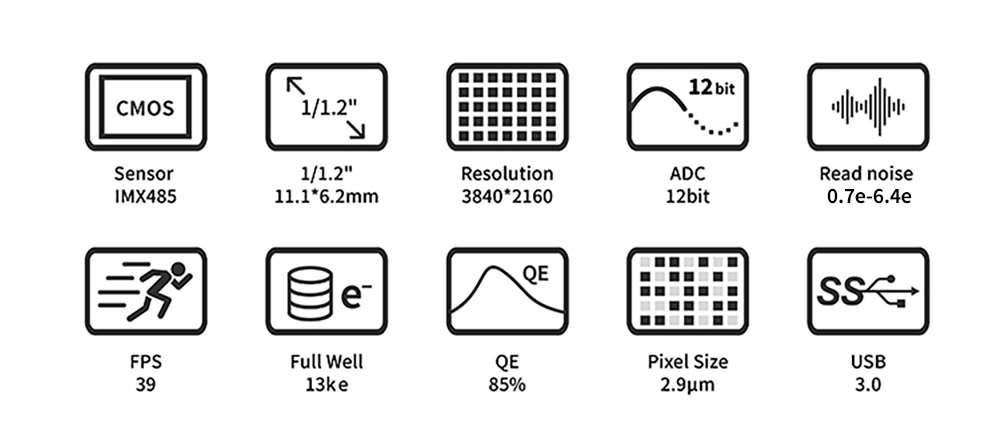 ASI485MC shares the same pixel size of 2.9um with ASI462MC, but when it comes to resolution, ASI485MC is 4 times bigger than ASI462MC. The total number of pixels is 8.28 million. The sensor length and width are 11.13mm*6.26mm. The diagonal is 12.86mm.