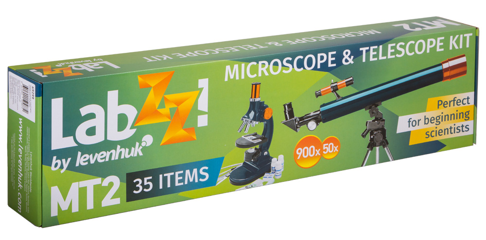 A wealth of interesting discoveries awaits your kid with Levenhuk LabZZ MT2 Microscope & Telescope Kit! The kit includes a biological microscope with an experiment set and a refracting telescope. These instruments feature high-quality optics, reliable design, and convenient use. The guide is written especially for the youngest explorers in a user-friendly and easy-to-read manner. The kit is designed for children over 6 years of age. Teenagers will also enjoy exploring the skies or the micro world with Levenhuk LabZZ MT2.