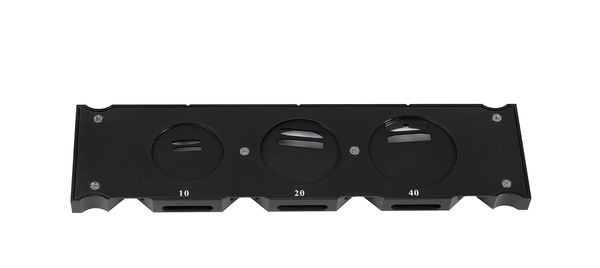 The Hoffman slider is inserted in the slot of the Hoffman condenser. The slider is a plate with three round inserts for 10x, 20x, and 40x objectives. The marking of the insert matches the objective being used. There are two slots in each insert: one is free and the other one is closed by a polarizer. The inserts in the slider are 360° rotatable and centerable.